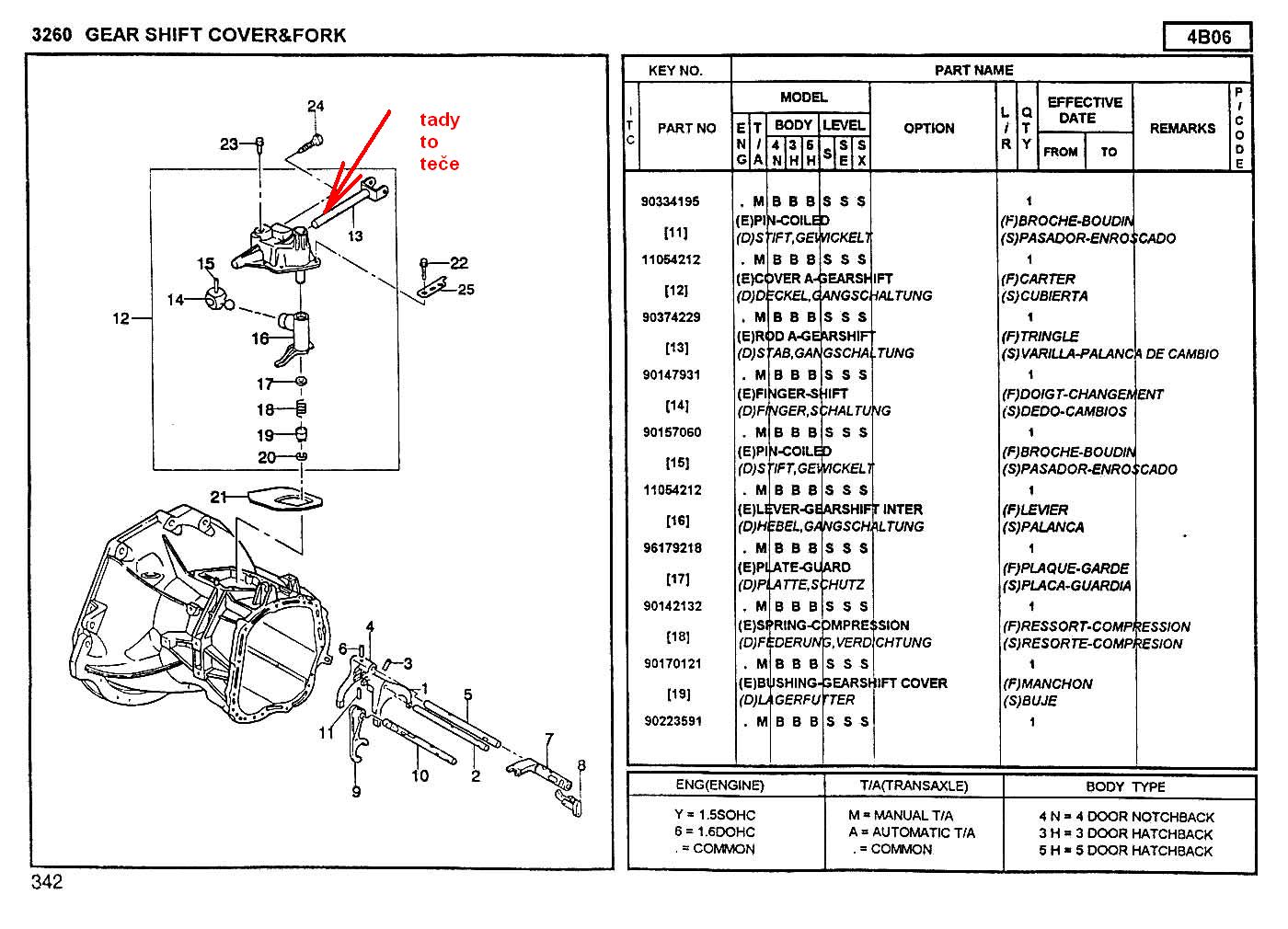 U mého Lanose, motor A15SMS, začal unikat olej z převodovky horem podél táhla řazení. Na první pohled to vypadá jako banalita, ale pohledem do katalogu dílů jsem zjistil, že výrobce čísluje vrchní díl převodovky jako celek / díl 90374229 /