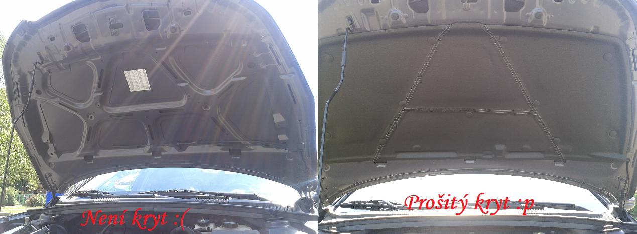 Hele čím máš prošitý ten kryt motoru? Možná blbá laická otázka... nevadí to nějak vůči teplotě motoru, pač ta teplota tam je při zahřáti motoru fakt velká...