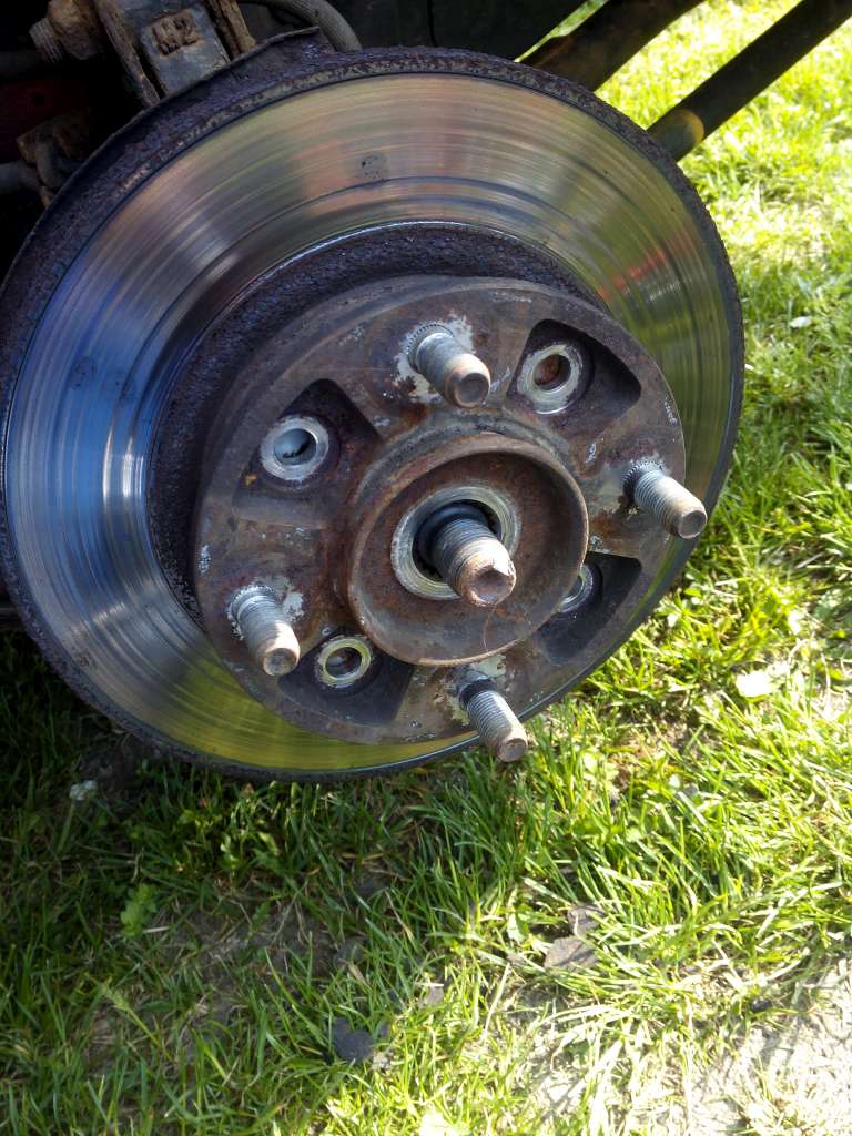 Skutečně není jiné řešení, než jak tu je psáno, odmontovat celou těhlici s nábojem, náboj vyrazit a ložiska vylisovat. Tím je zničíš a musíš vyměnit. Pak teprve jde odmontovat kotouč. Je to hrozně nešťastný řešení, který jsem u jinýho auta neviděl. Je to stejný už od Tica