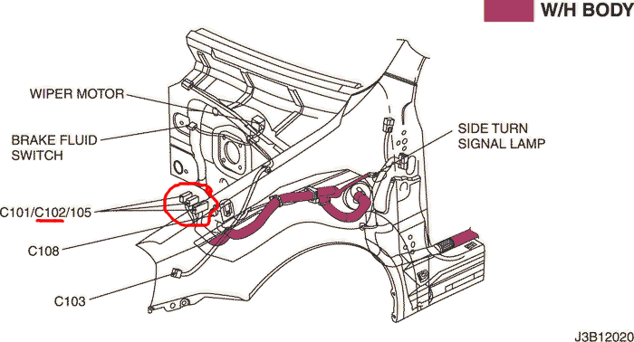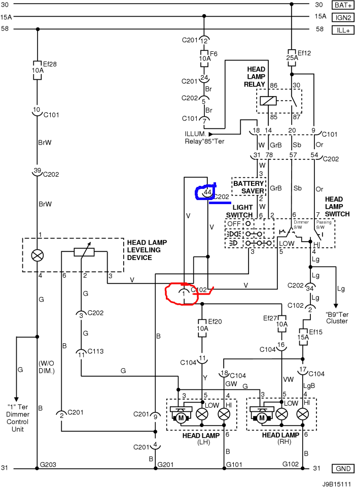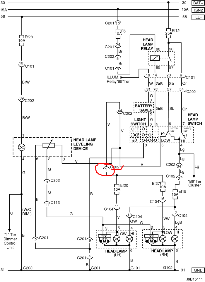 No pokud jseš si jistej, že to není rele, přepínač, ani pojistka, tak by to mohl být tenhle kontakt v konektoru C102. Pak už jdou dál dráty ke každýmu světlu sólo. To už by byla velká náhoda aby odešli obě světla naráz. (ale to schema je na Lacetti HB 2009, nevím jestli je stejný..)