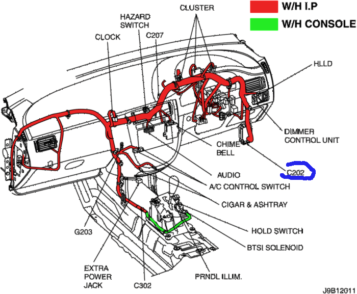 Podle zde uveřejněného schématu jsem se snažil najít vodič který vede k přepínači světel u volantu č.57. Na něj totiž nešlo napětí z relé.